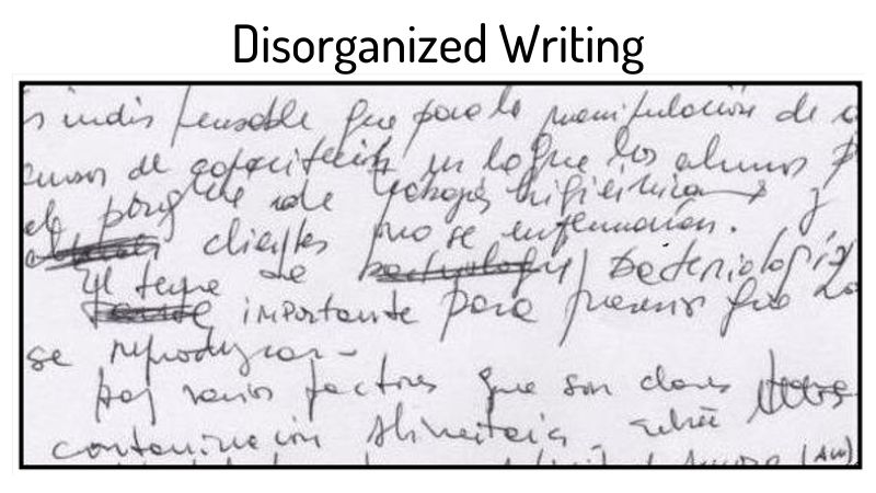 For writing to be considered organized, it must remain clear throughout the entire text. When analyzing a letter, if at the beginning (where conscious thought predominates) clear spacing between lines, words, and letters is observed, but at the end (where the unconscious dominates) the text becomes more condensed or confusing, the writing is considered disorganized.