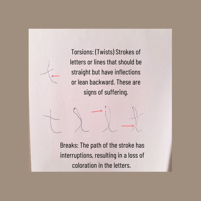 Torsions: (Twists) Strokes of letters or lines that should be straight but have inflections or lean backward. These are signs of suffering. Dr. Resten discusses them in “Les écritures patologiques.” It’s important to examine where in the writing they are located, whether in the upper, middle, or lower part. When they appear in the upper part, they indicate that suffering has a mental component related to distressing thoughts. Possible physical issues should also be considered.