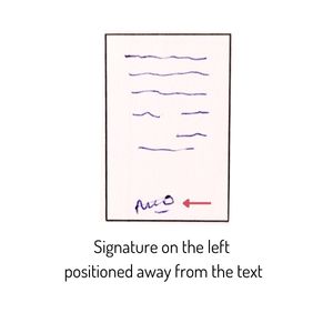 Signature on the left: Positioned away from the text and on the left side of the page instead of the right margin indicates isolation with a regressive attitude. Psychological immaturity. When faced with minor issues, the individual reacts with childish behavior. It blocks contact with reality due to insurmountable obstacles. It can also be interpreted as social or professional disinterest.