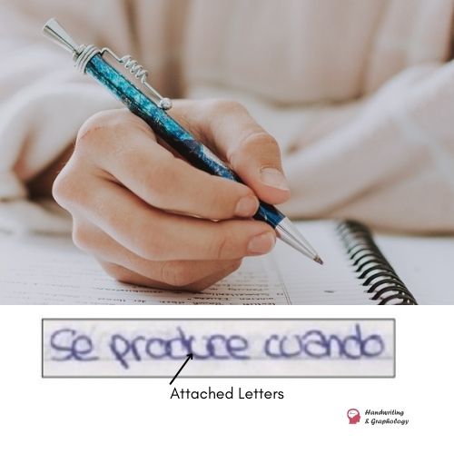 According to A, Vels in “Graphology from A to Z“, “the attached ones affect the spacing between letters, causing adhesions or hooks between letter and letter, in some cases the letters are mounted or superimposed on each other, without necessarily being a tight writing since the width of the letters can be normal or even greater.