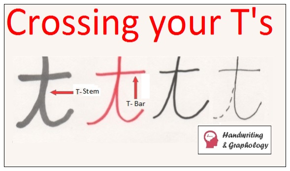 In graphology, letter T is studied in both strokes. The stem or upper extensión and the bar.